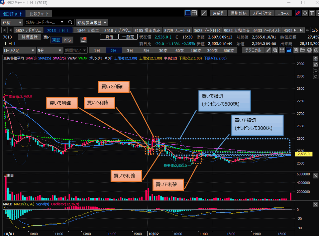 ・IHI、寄りから下げを見た後に買いでエントリ即利確。その後上昇したので買いでエントリして利確。(ここまでは良かったです。。)9時15分過ぎに今日はこのまま上げるのか!?と思い買いエントリしたところに大きめの下落、、大きく下げ過ぎたので即損切できずホールド。。。その後ナンピンを入れつつ、底値で買い利確(9時半ごろ)。下げからの横横から、11時前に上昇気配だったので買いエントリし11時ごろにテッペンで利確。その後の上げを期待し買い(ナンピン)を追加。。。前場終了。