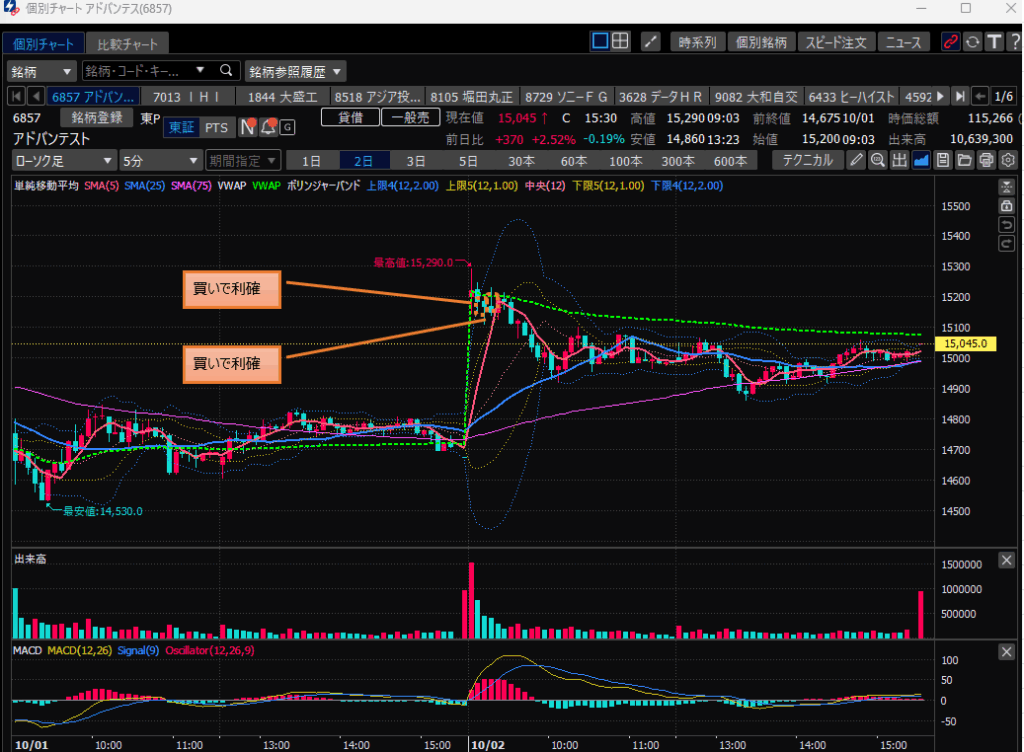 ・寄り後に、アドバンテストで買いエントリ、即利確。(その後下げていったので手じまい)(昨日と一緒。。)