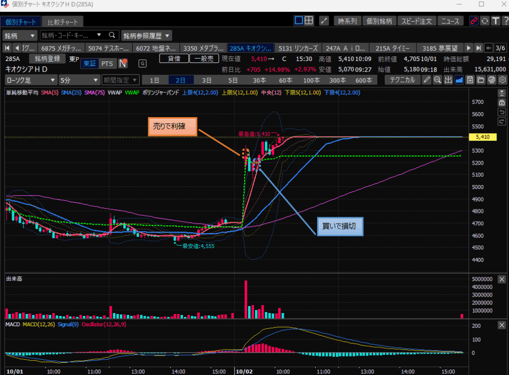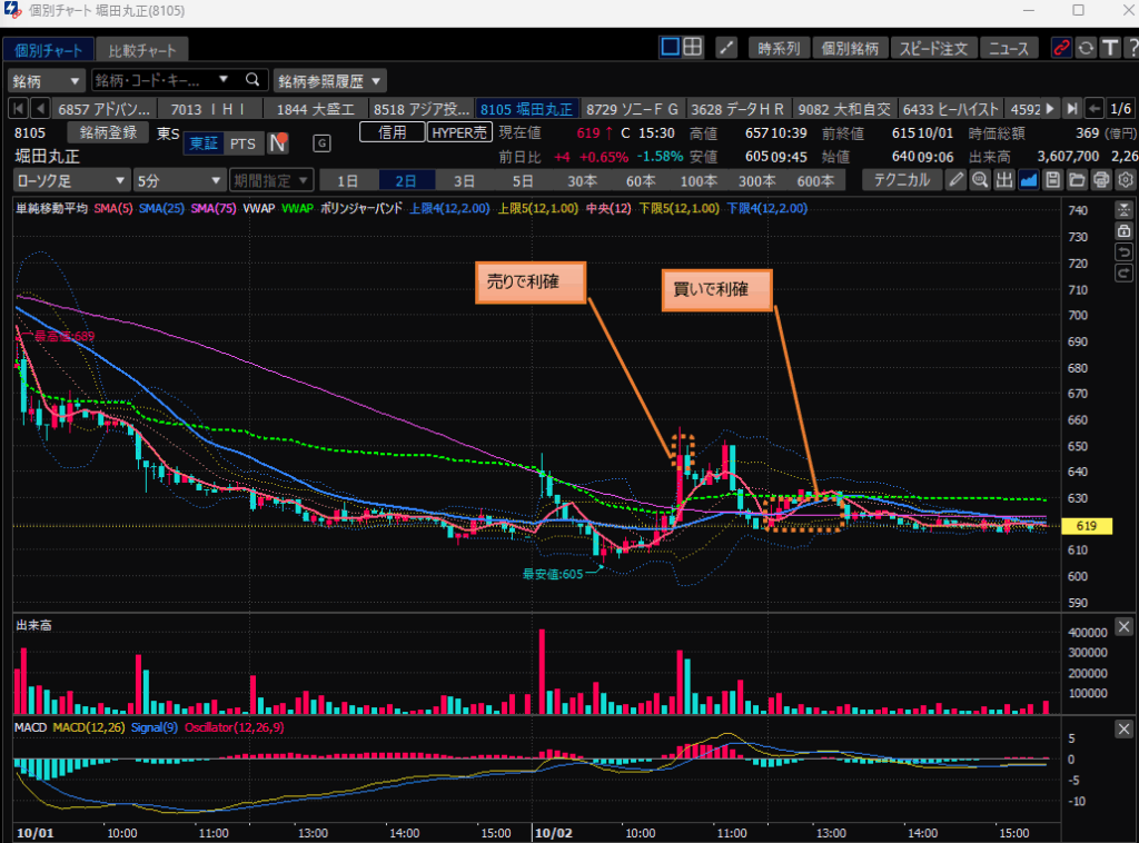 ・堀田丸正、10時半ごろに急騰を検知、上げには乗り遅れたので売りでエントリして利確。