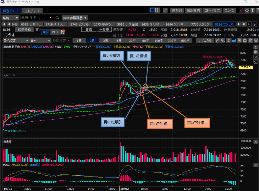 ・サンリオ、9時半ごろに底値かと思い買いエントリするも下げたので損切執行(×2)。。その後上げたので買いエントリ複数回、利確損切繰り返し、、、TOTALはマイナス2000円程度。。