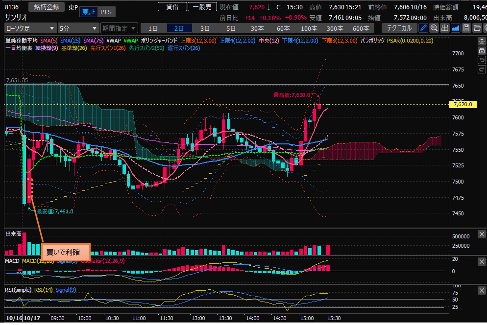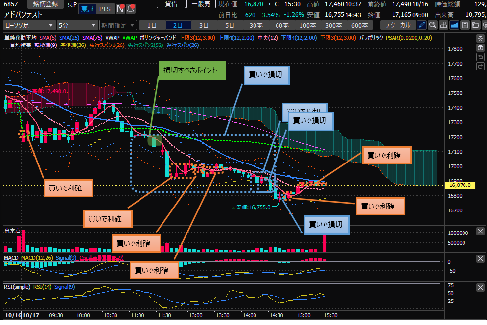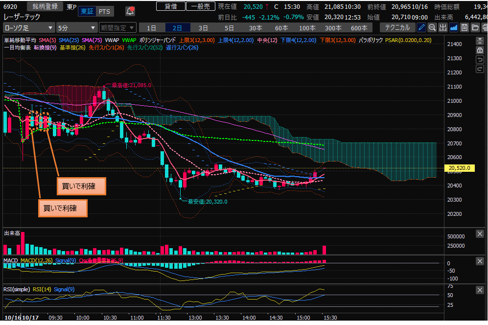 大きな流れはどっちに向いているか(昨晩米市場、日経平均、日経先物)、個別銘柄では日足でのトレンド把握(5日移動平均線、ボリバン、MACD)、個別銘柄の5分足チャート(VWAP、ボリバン、移動平均線)あと一目均衡表の雲も表示させて、サポート/レジスタンスラインを見つつエントリすること。※今日も出来ていないので再掲