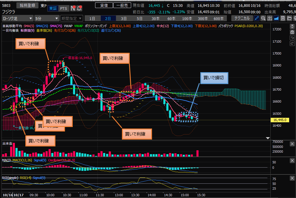 前場コツコツ、後場どかーん。(損切遅いのと、何より下げ相場に対する立ち振る舞い準備ができていなかったです。。)前場から下げる予兆はあり。。