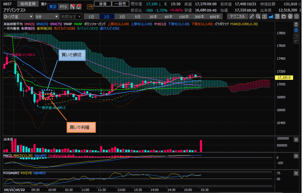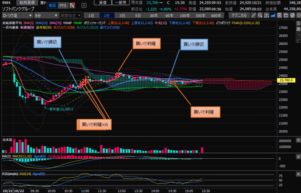 ・ソフトバンク、11時ごろに買いエントリするも、一回損切。その後、リバの上昇に乗って利確。(これもVWAP上だったのでちょっと強気にエントリしました。)一目均衡の雲に突っ込む前におさらば。(案の情、雲に当たって下がってました。。。)