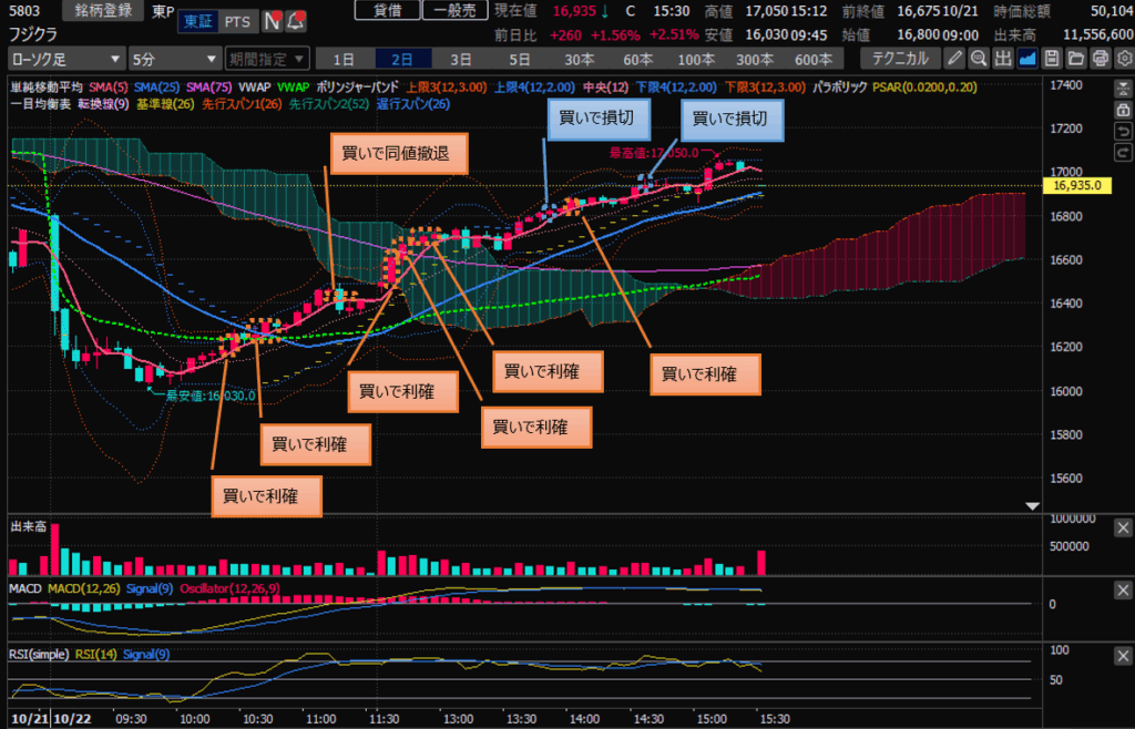 ・フジクラ寄りから上げて下がってまた上がそうだったので買いエントリ(雲の中)、何度か買い利確。その後横横気味にジワ上げ、買ったら下がったので損切×2、利確×1をTOTALはプラス。15時ごろの引けにかけての上昇は、下落が怖くて入れませんでした。。