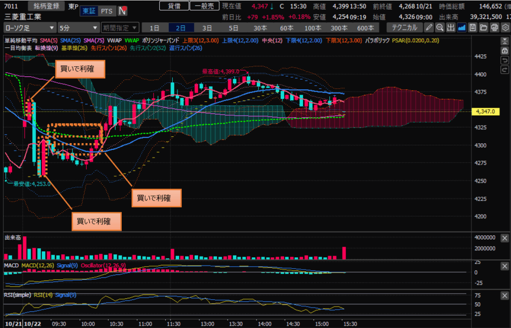 ・半導体から資金が抜けるのであればと、、防衛銘柄(三菱重工)にエントリ。買いで利確。いったん下げてから底値でとって買い利確。その後下げたがナンピンして戻りで利確。(思った以上に取れたのでよし)