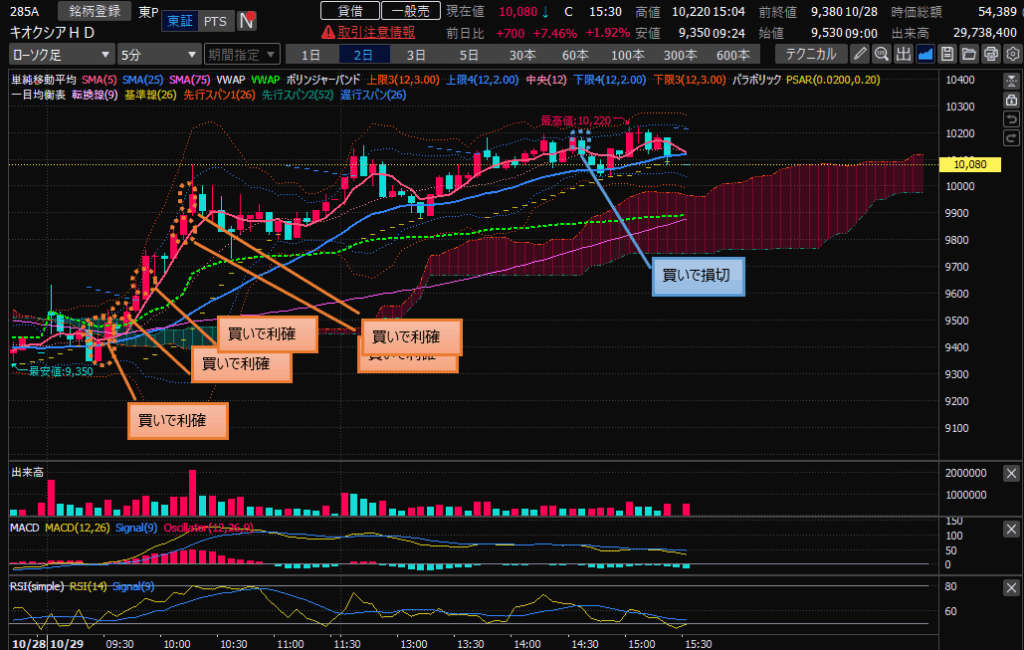 ・キオクシア、寄りから陰線付けていたので、切り返しを期待して9時半ごろから買いエントリ。10時過ぎまでの上昇をとらえて複数回エントリ&利確。(本日の利益はこれのみ。。)10,000円付けたあたりで下げを警戒して撤退。。(VWAP超えてからの上昇がすごかった。。)