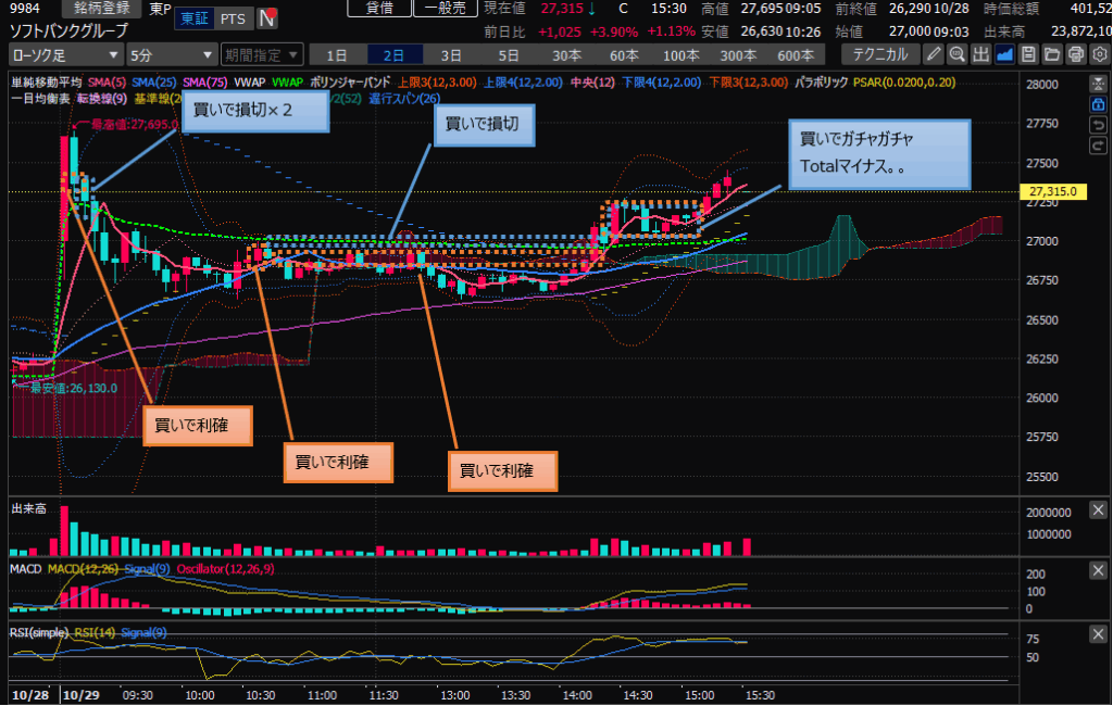 ・ソフトバンクグループ、寄りから上げて下落、また上がるんではないかと期待して9時7分買いエントリ、即利確。(VWAPで反発)