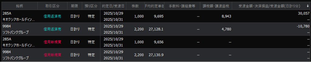 ・キオクシア、10,000円の大台を突破してどこまで行けるか様子見しつつ、14時半ごろの買いエントリ、下がったので即損切して手仕舞い。結果的に10,220円まで行ってましたね。。