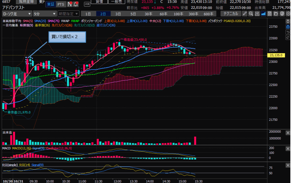 【①買い建てしているとき、「一目均衡表の雲」または「Vwap」を下回ったタイミングで、損切して手放す。それ以降は買い下がらない。】