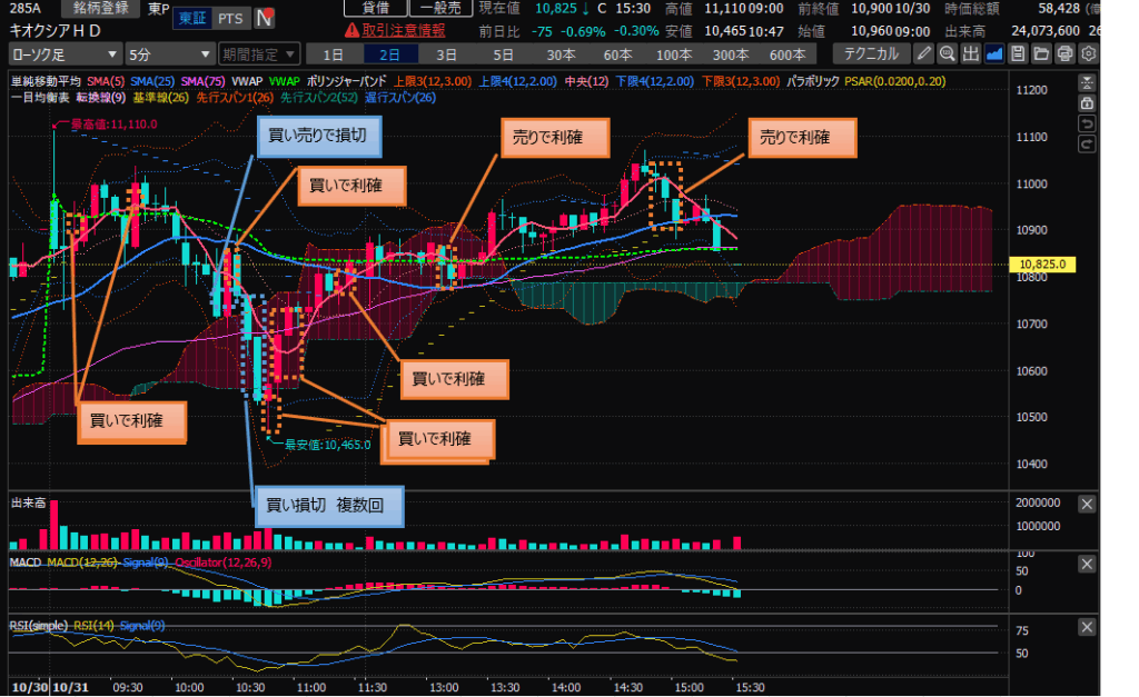 ・キオクシア、13時過ぎと14時半過ぎの下落を売りで利確。