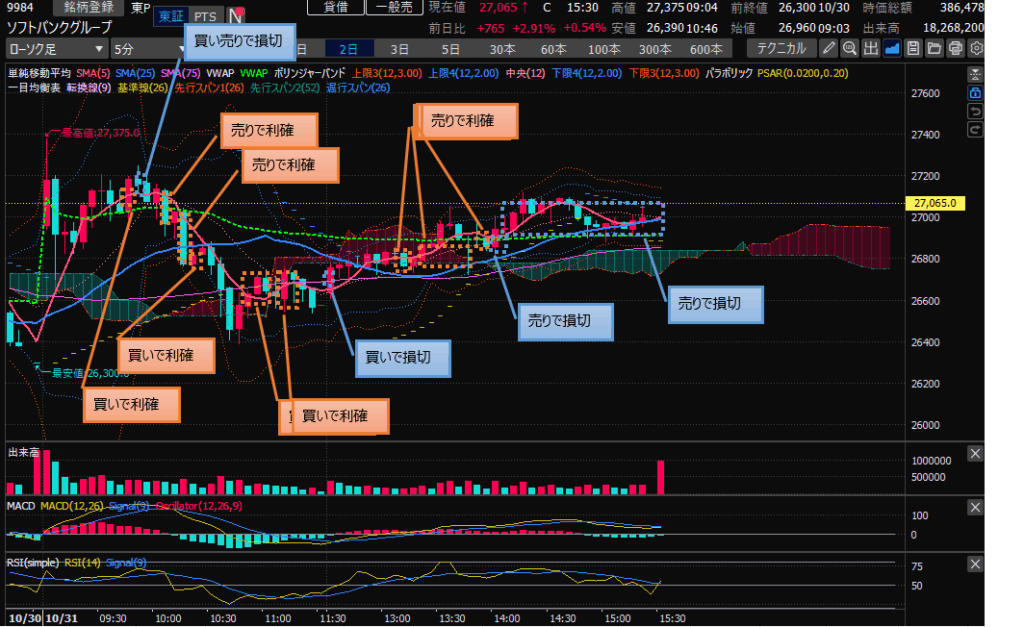 ・ソフトバンクG、10時前からVWAP超えたあたりで買いエントリして利確、高値つかんで損切。下げを売りで利確。(昨日散々やられたので買い下がらず売りでゲット)11時頃からの反発で買い利確。
