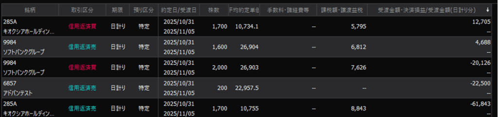 ・前場、勇気をふりじぼって入ったアドバンテストで高値つかんで損切して即撤退。キオクシアで下げくらって大損。
