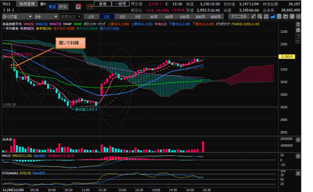 ・半導体は下がるとして、防衛は?と思いIHIにエントリするも、下げそうっだたので即利確逃げ。
