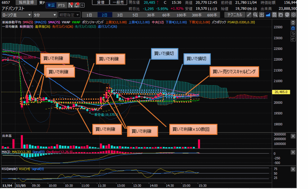 ・アドバンテスト、こちらも後場から急回復。前場買い建て玉を利確して、上昇についていくように買いスキャ。したら、13時前に高値で捕まってしばらくホールド。。別建てで細かく買いエントリ、利確を繰り返す(スキャ)。14時過ぎに再上昇したところで買い建て損切。その後の下落はスキャで損切連発。。引けにかけて細かくスキャしてTotalトントン。
