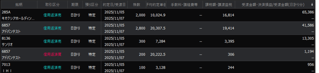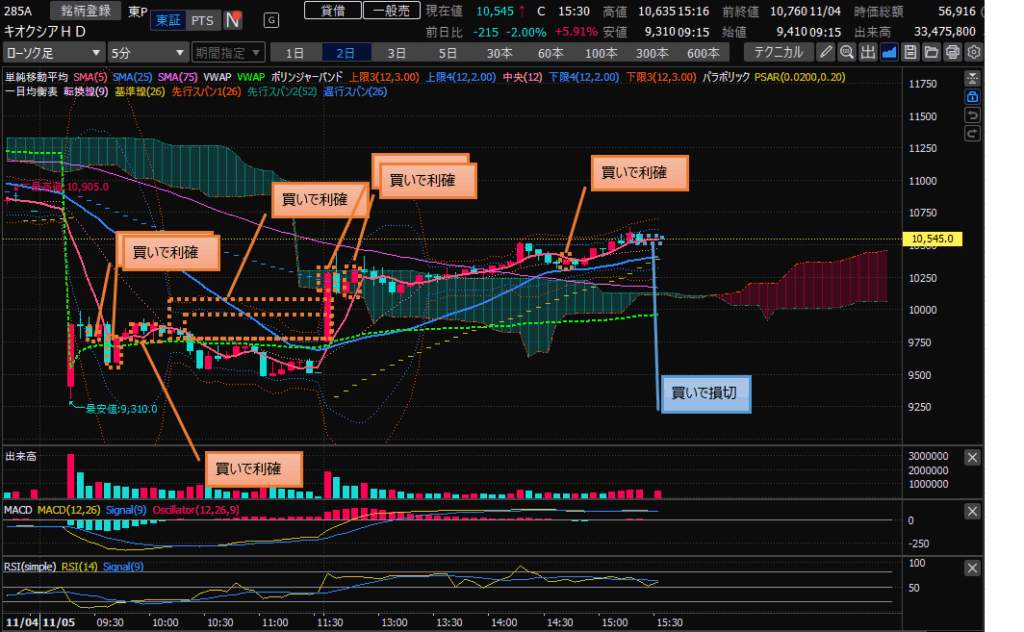 ・キオクシア、後場寄りから激リバ。含み損が一気にプラ転したのでスライスして利確。その後も上昇場面で買いエントリして利確。