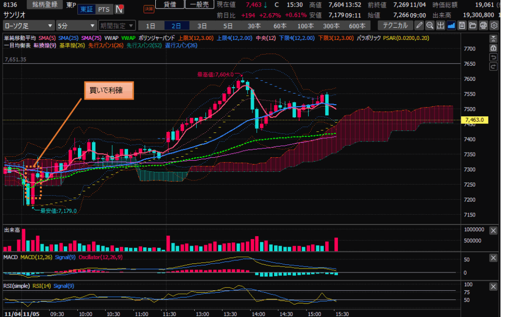 ・サンリオ、寄りからの下げを見て、底値近辺で買いエントリして利確。