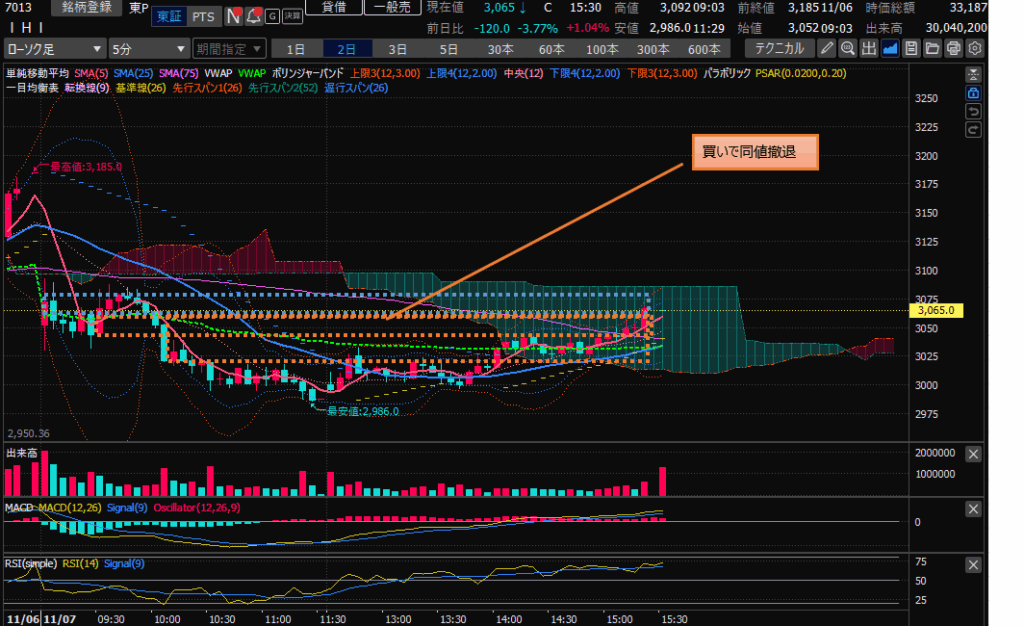 ・IHI、ギャップダウンからの上昇を期待してエントリ。昨日決算を超え、午後に三菱重工決算で連れ高するのではないかと思い買い下がり。したものの前場は下がる一方でVWAP下へ、、。後場に戻すだろうという予測の元ホールド。