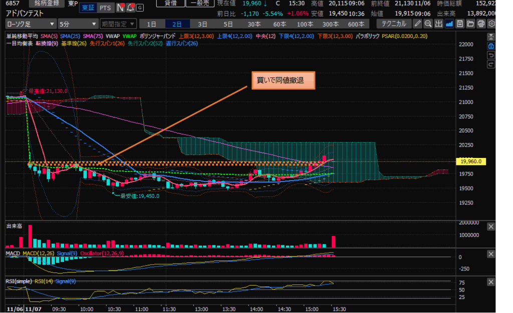 ・アドバンテスト、引け間際に取得単価に来たので、欲張らずに同値撤退。