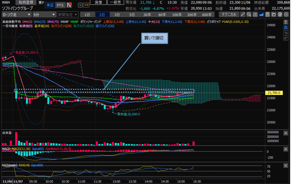 【①買い建てしているとき、「一目均衡表の雲」または「Vwap」を下回ったタイミングで、損切して手放す。それ以降は買い下がらない。】