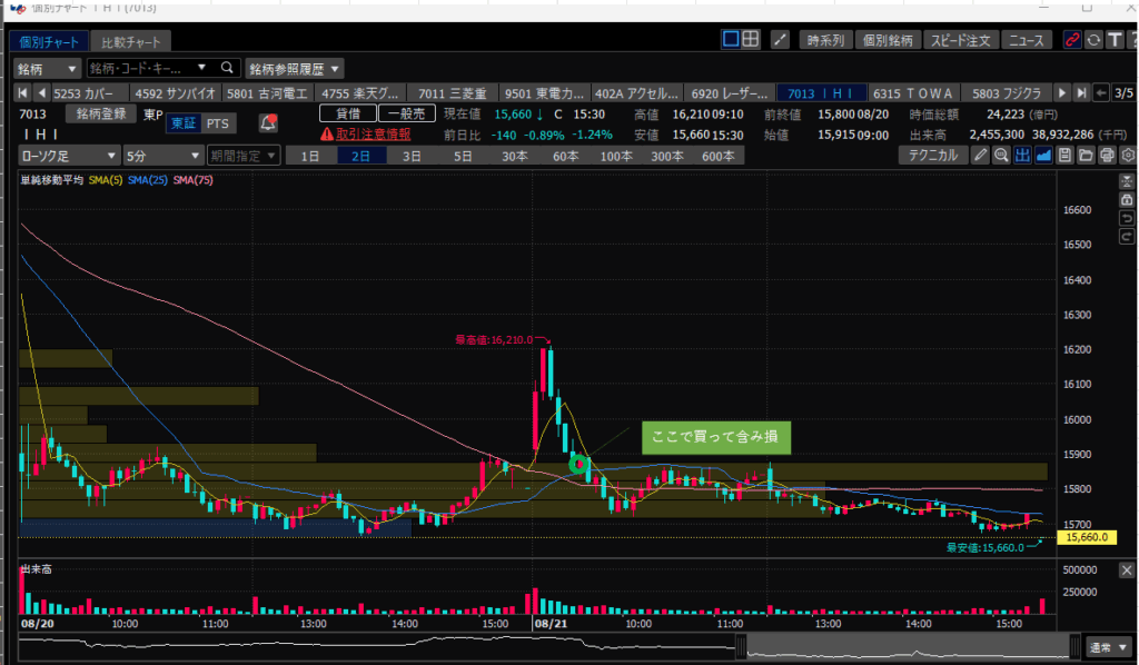 ・IHIの急落のふもと近辺でリバウンド期待した買い。貫通されて含み損に。後場に持ち越し。。。。