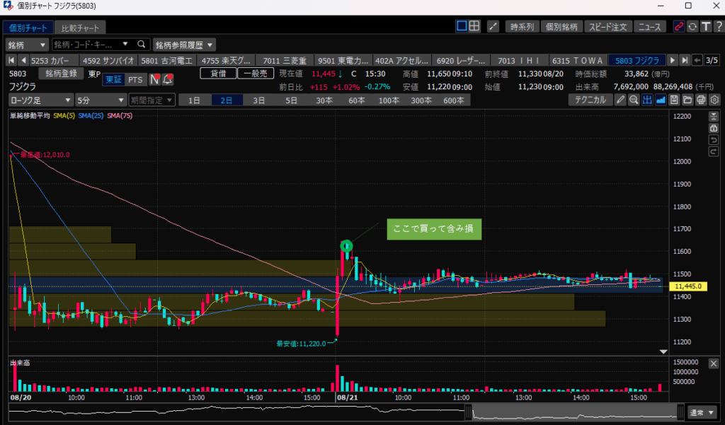 ・フジクラの急騰天井でもっと上がると思って買いでエントリ。。。これ含み損になりました、、。