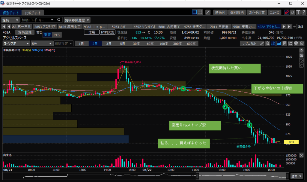 含み損作りつつ後場突入してからがひどかった。。。横横、踏み上げ、急落、だまし。。からの買い戻し忘れ!!!!