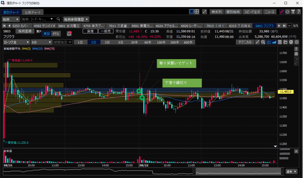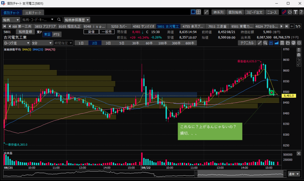 ・古河電工、引け間際の下落からの上げの空気感を醸し出したうえで、結局下。。。買いで入ってしまったので損切。。。