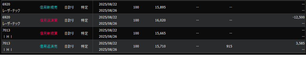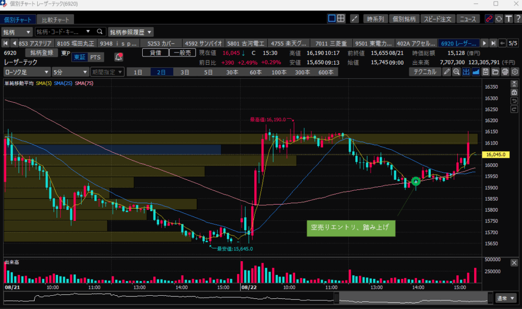 ・レーザーテック売りでエントリ、まさかの踏み上げ、、お宅もですかい!!!損切。