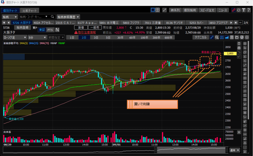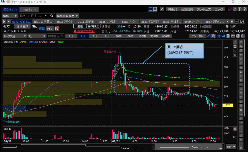 ストップ高行きそうでも、直前で折り返し売り圧が高まることがある。欲張らず確実に利確してしまった方が良い。