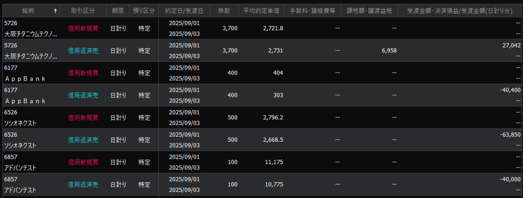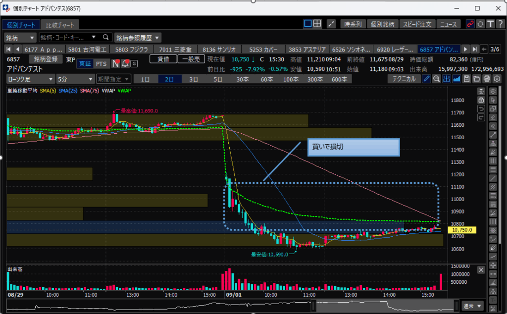 朝気配を見て、下げ幅の大きそうなところをチョイス。アドバンテスト、ソシオネクスト。