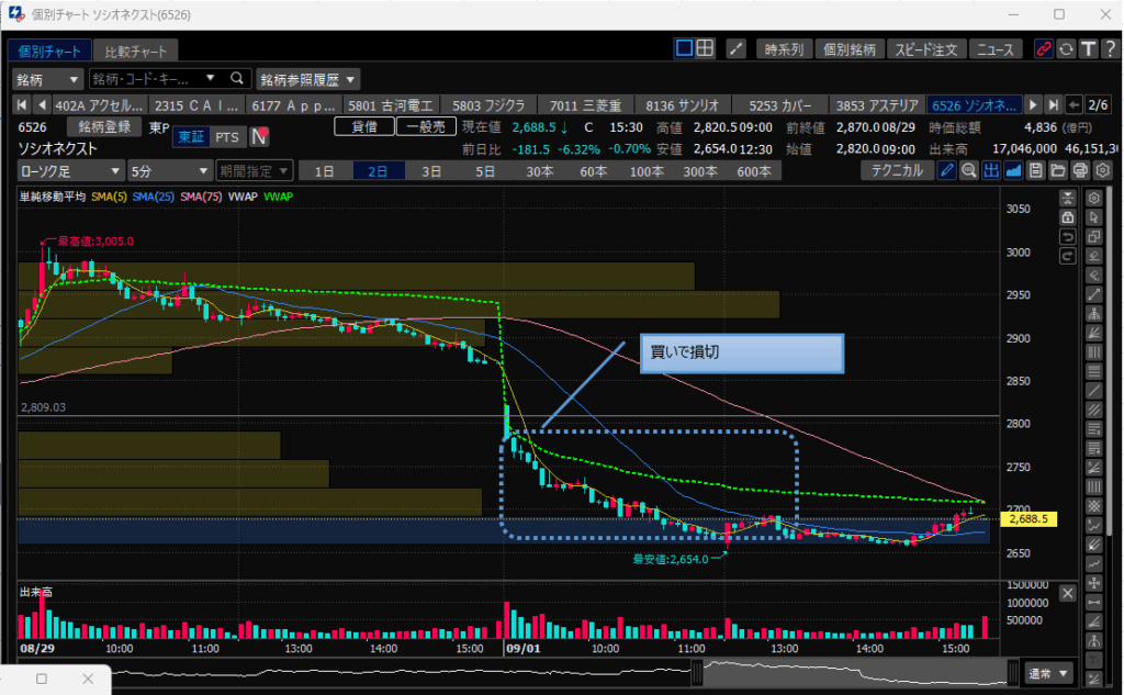 ・寄り付き後、ソシオネクスト、アドバンテストの下げを見つつ買いでエントリ。リバウンド待ち。