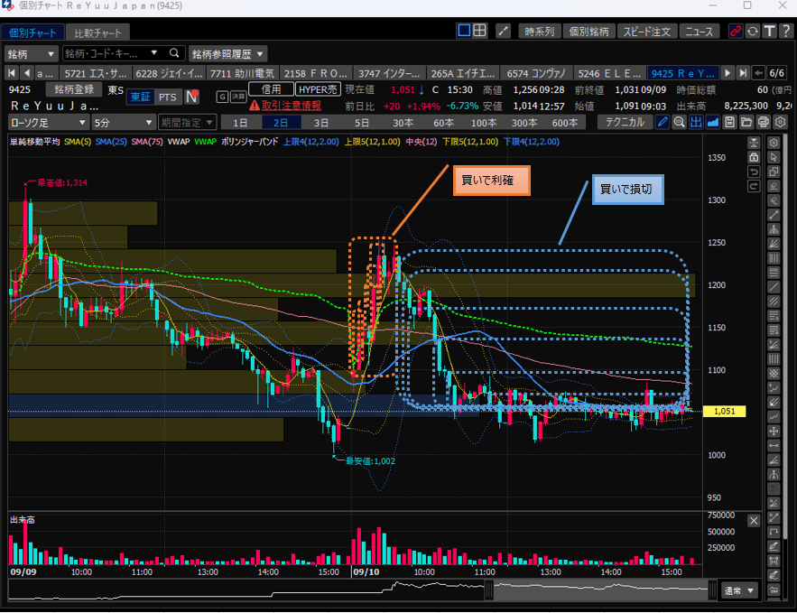 ・ReyuuJapan、後場寄りから上げるも上げ切らずに横横。前場持ち越し分に追加して買い下がり、、、上がると見せて売り圧に下げられる。自責の念で戦意喪失。。。
