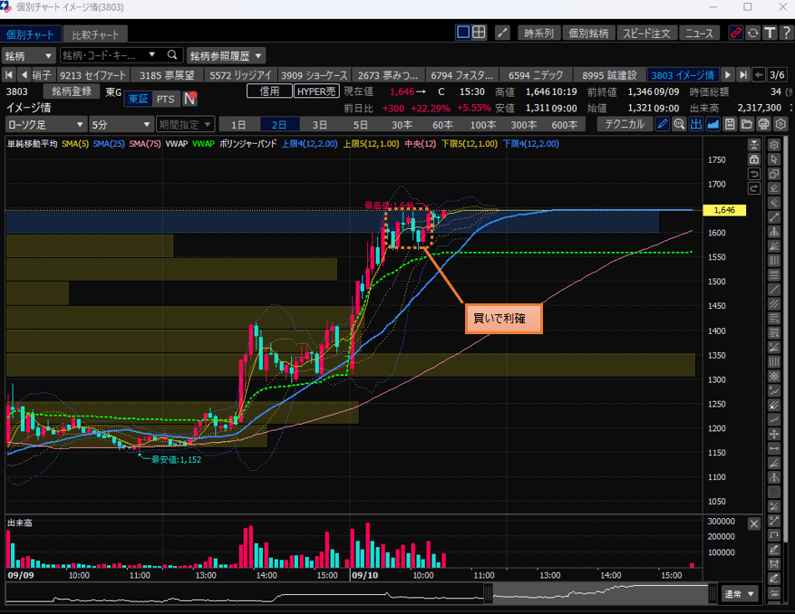 ・イメージ情報開発、上昇トレンド終盤(ストップ高はりつき手前)で買いでエントリ。張り付きそうだったので買って放置。無事にストップ高1ティック手前で利確。