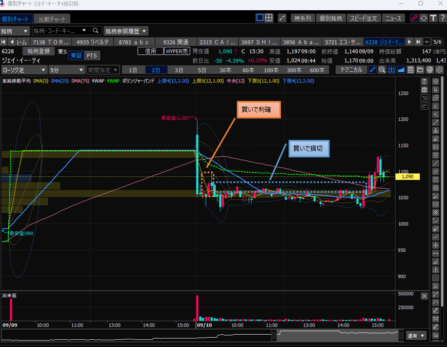 ・ジェイ・イー・ティ、前場持ち越し分の損切をようやくしようとした矢先に急騰。様子見したのちに下げそうだったので損切。その後、上げていった。。。。(こういうのがあるから損切出来なくなるんですよね。。。ただ、正解は即損切からの上げで再エントリ。損切出来てないのが悪。。。)