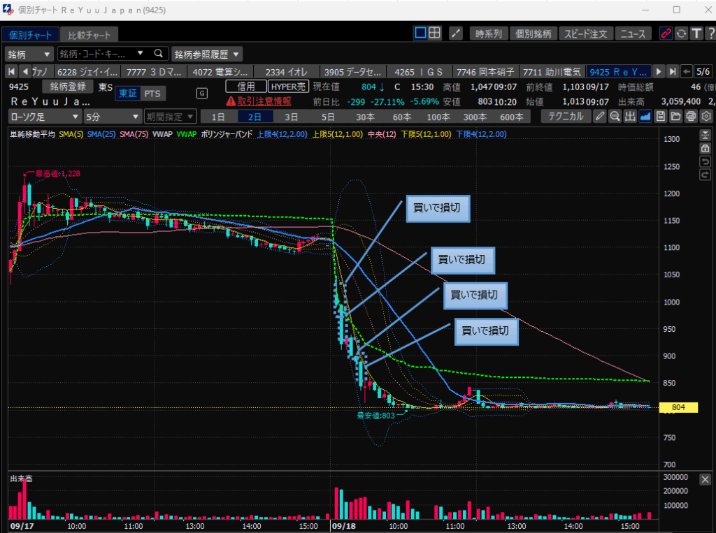 ・ReyuuJapan、ギャップダウンからの上げを期待し買いエントリするも、、、見事に下げ損切。その後も下げからの上げを期待したものの、ことごとく下がっていくので都度損切。。気づけばストップ安寸前までいったので撤退。。。これでマイナス3.5万程度を作りました。。。。