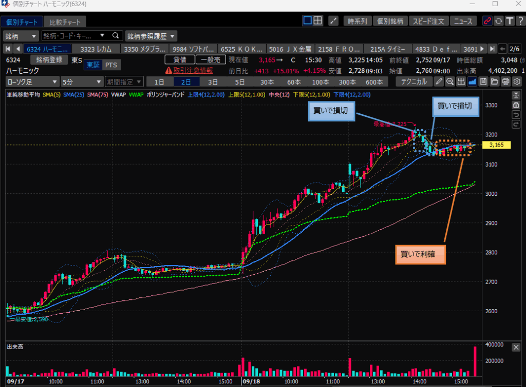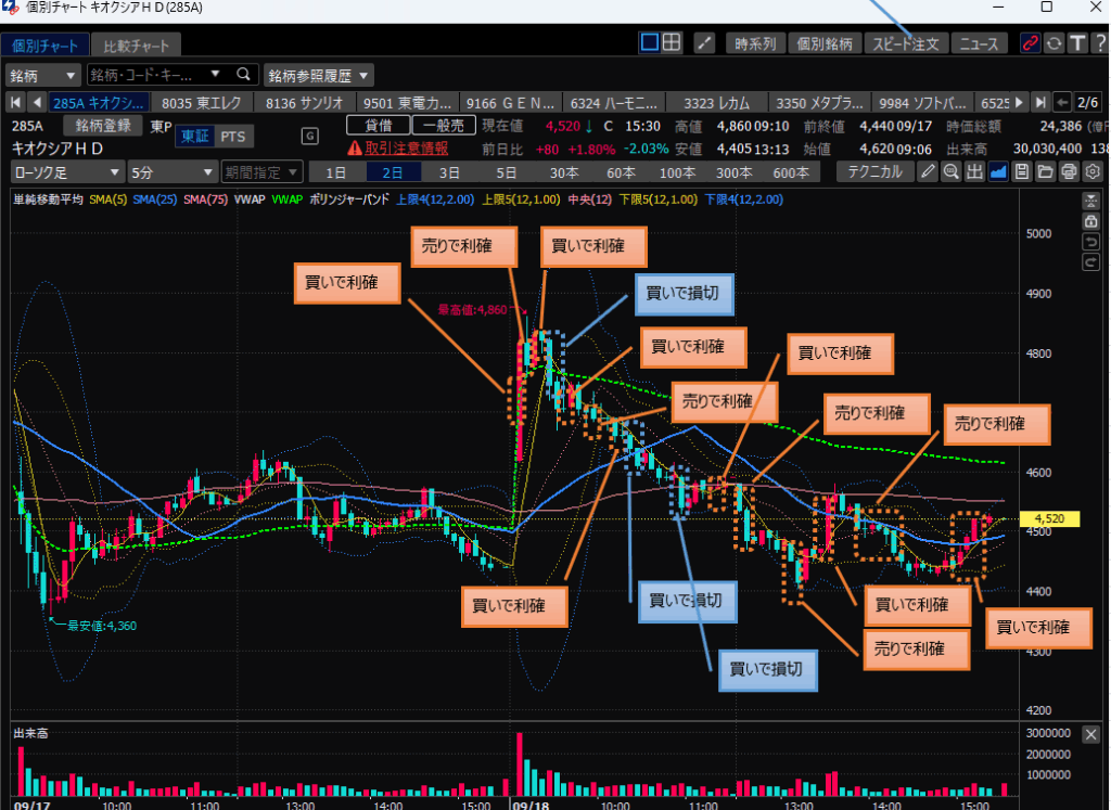 後場はさらに買い気配を感じなくなり、、キオクシアで売りをメインにエントリ。他急騰急落銘柄にエントリして、回収しつつ。