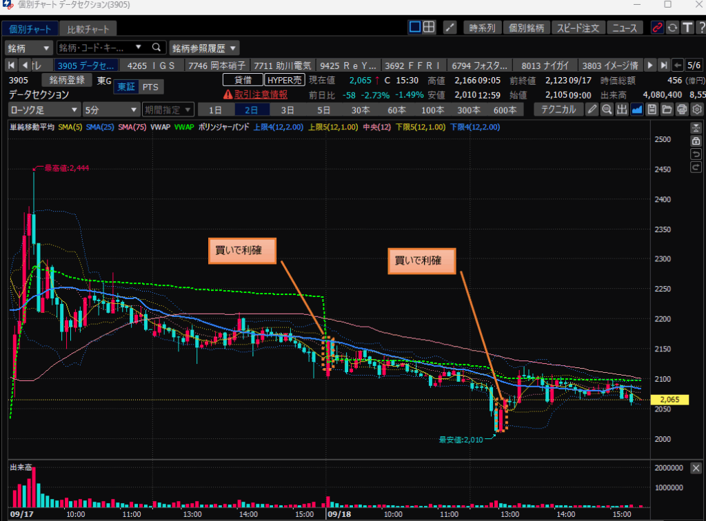 ・データセクション、13時ごろに大きく下げ、、、その後のリバウンドを買いにて利確。