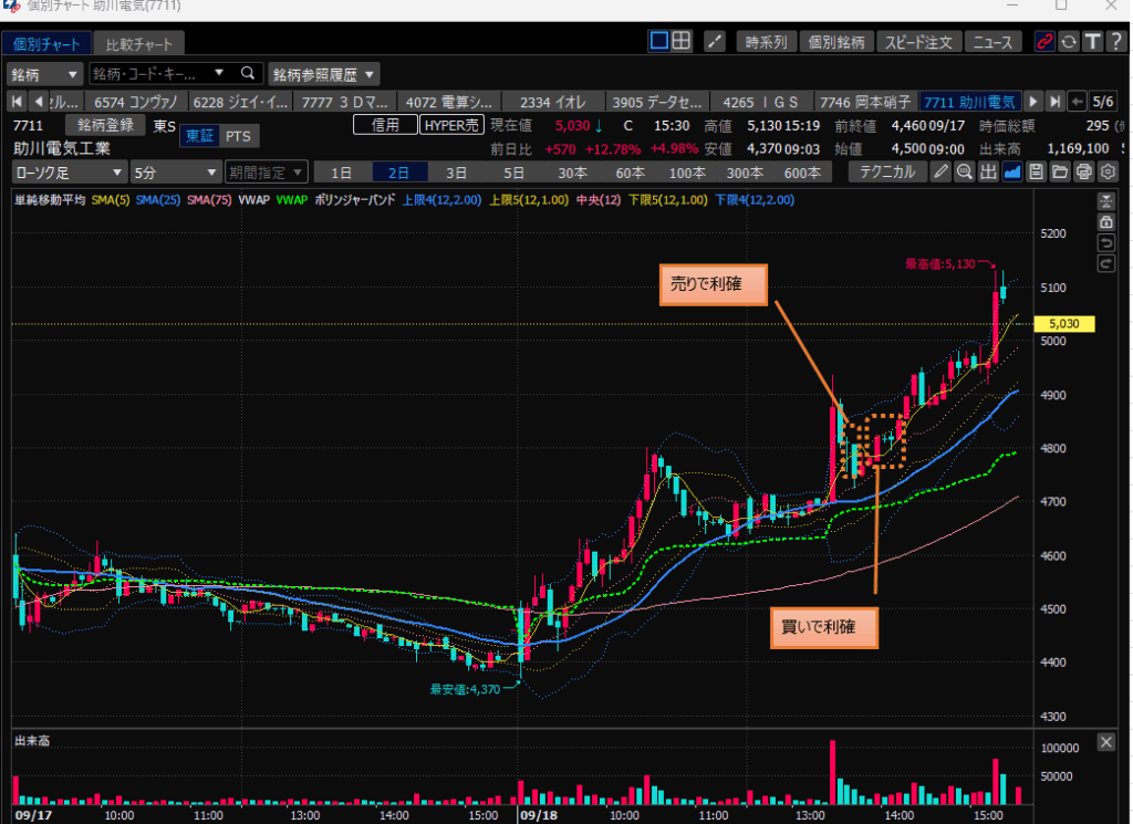 ・助川電気、13時過ぎに急騰を検知、その後の下げを売りにて利確。下げからの再上昇にて買い利確。(ひやひやでした)
