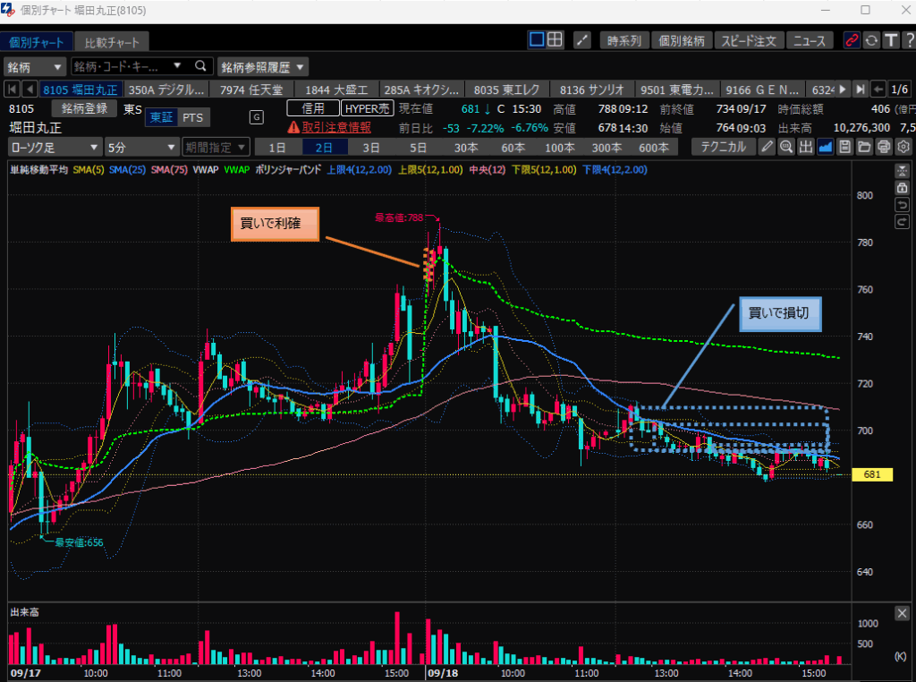 ・堀田丸正は寄りからちょびっと入って利確してすぐ撤退。。(その後下げていきました)