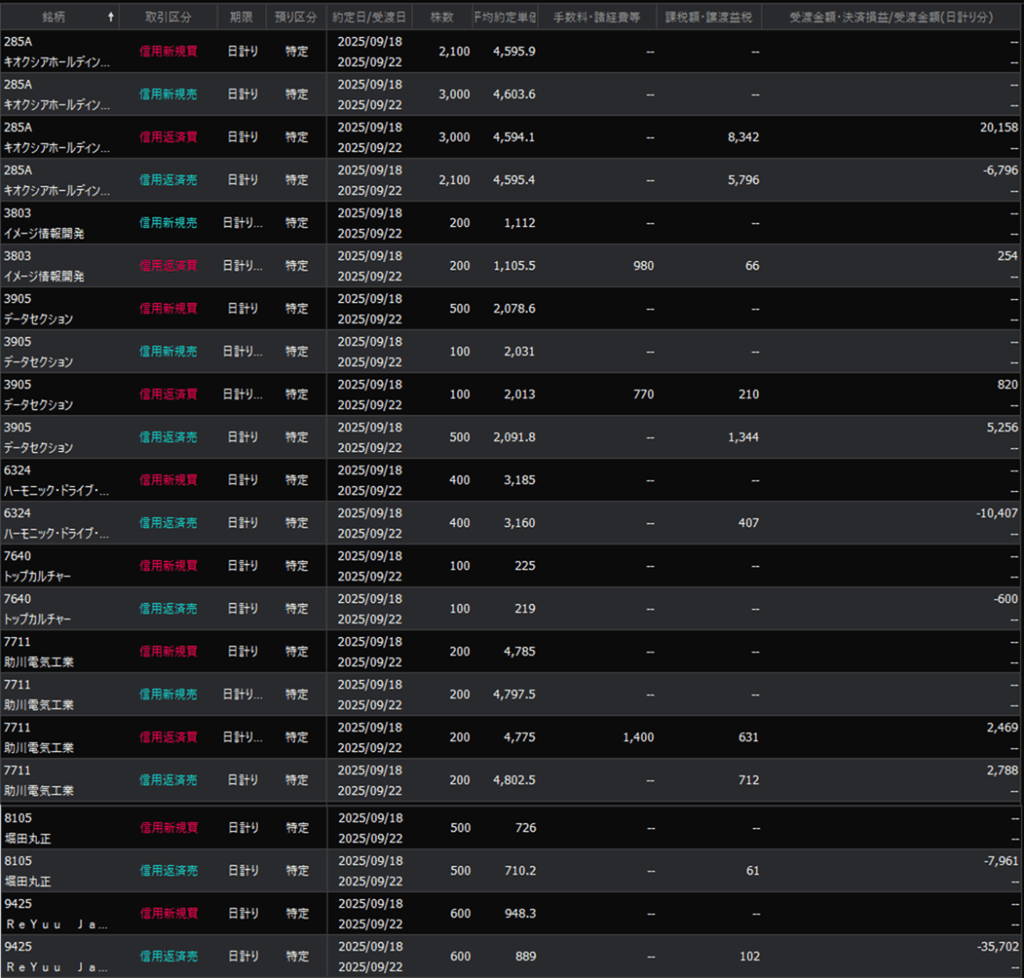 ・キオクシア、寄りからの上げとその後の下げでいったん買い売りで利確。その後の買いエントリを下げくらって損切。(これが大きくマイナス作ったところ)。その後は。買い、売りで細かく利確を続ける。