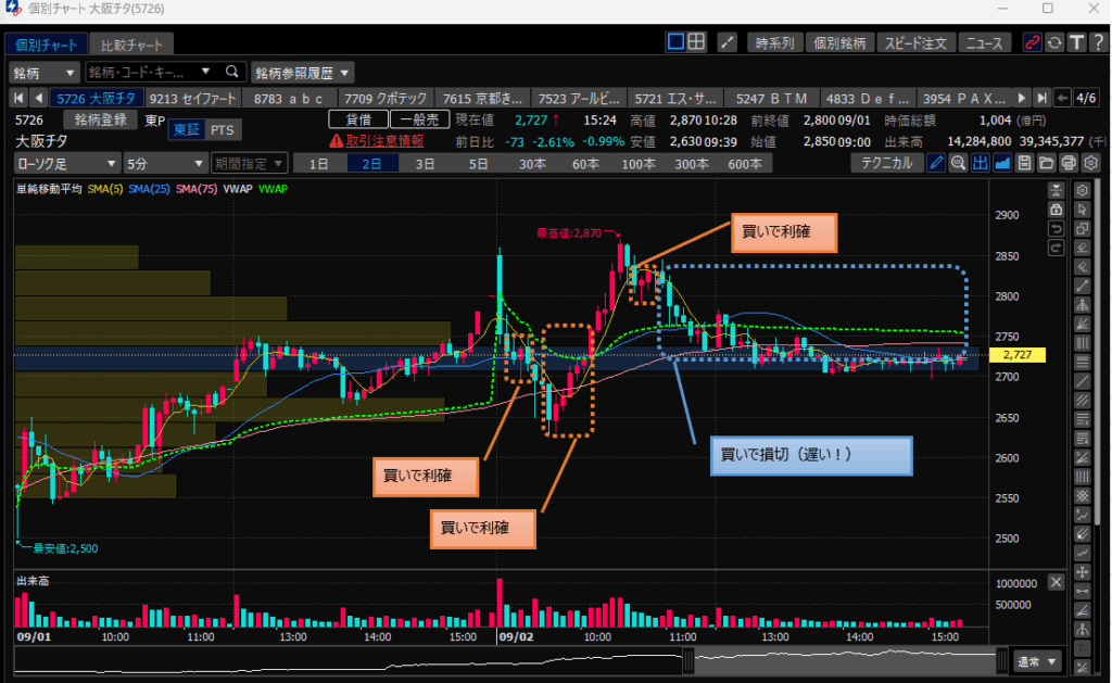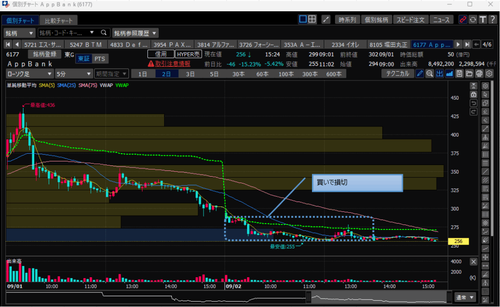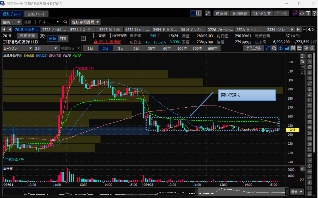・堀田丸正のピークからの下落後横横を経て、引け間際に上げる動きがあったものの即下落してしまい結局終値で損切。マイナス5万。(ダメな点④)