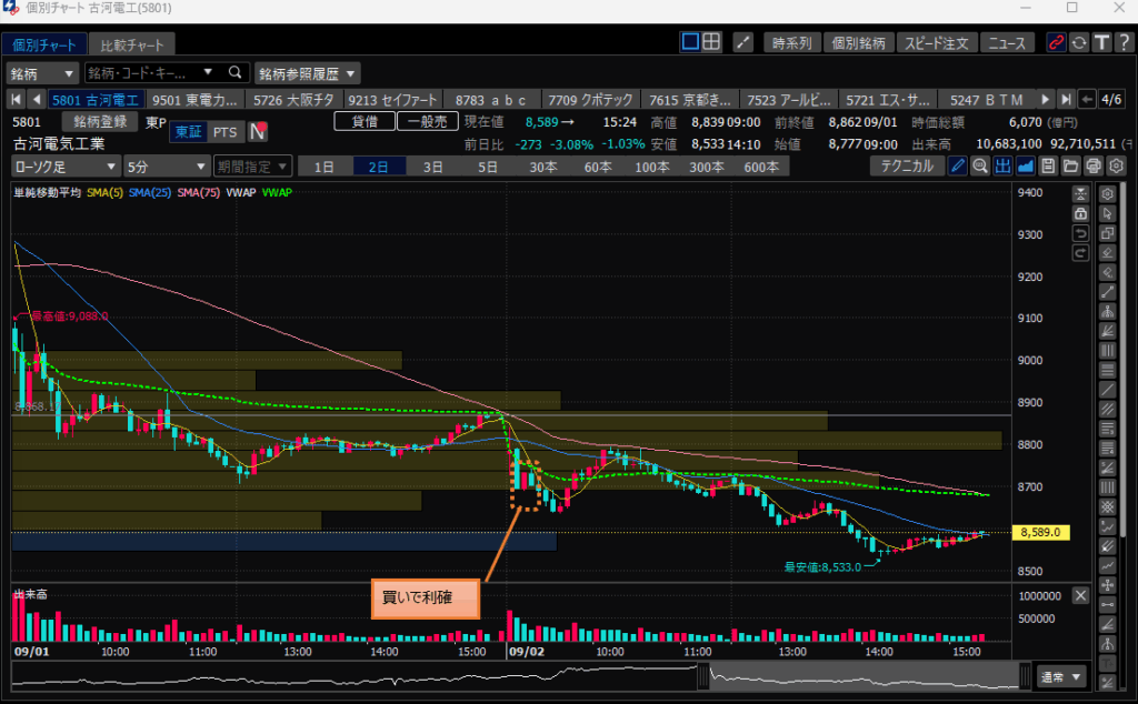 ・暇+資金余っていたのでので古河電工でちょびっと買いで利確。