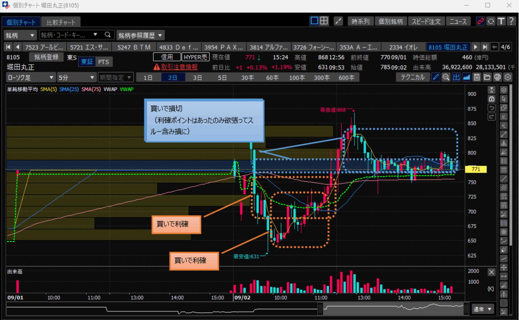 ・ダメな点④:堀田丸正の引け際の上げで損切せず、再度下がってからの損切。(損切額として2万くらいの差がある)