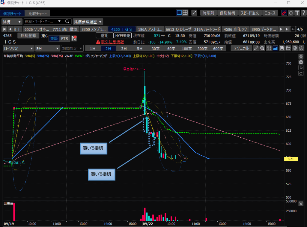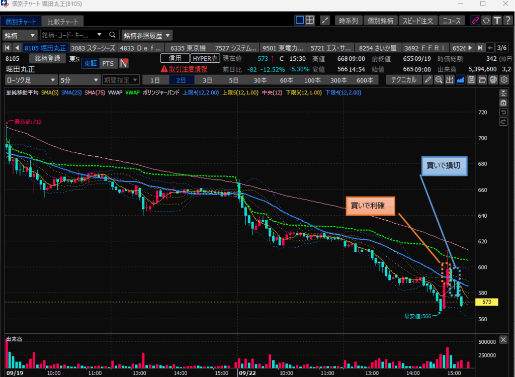 ・堀田丸正、15時ごろに底値からの急騰を検知、買いで微益利確するも、その後の買いで損切。。。結果マイナス。