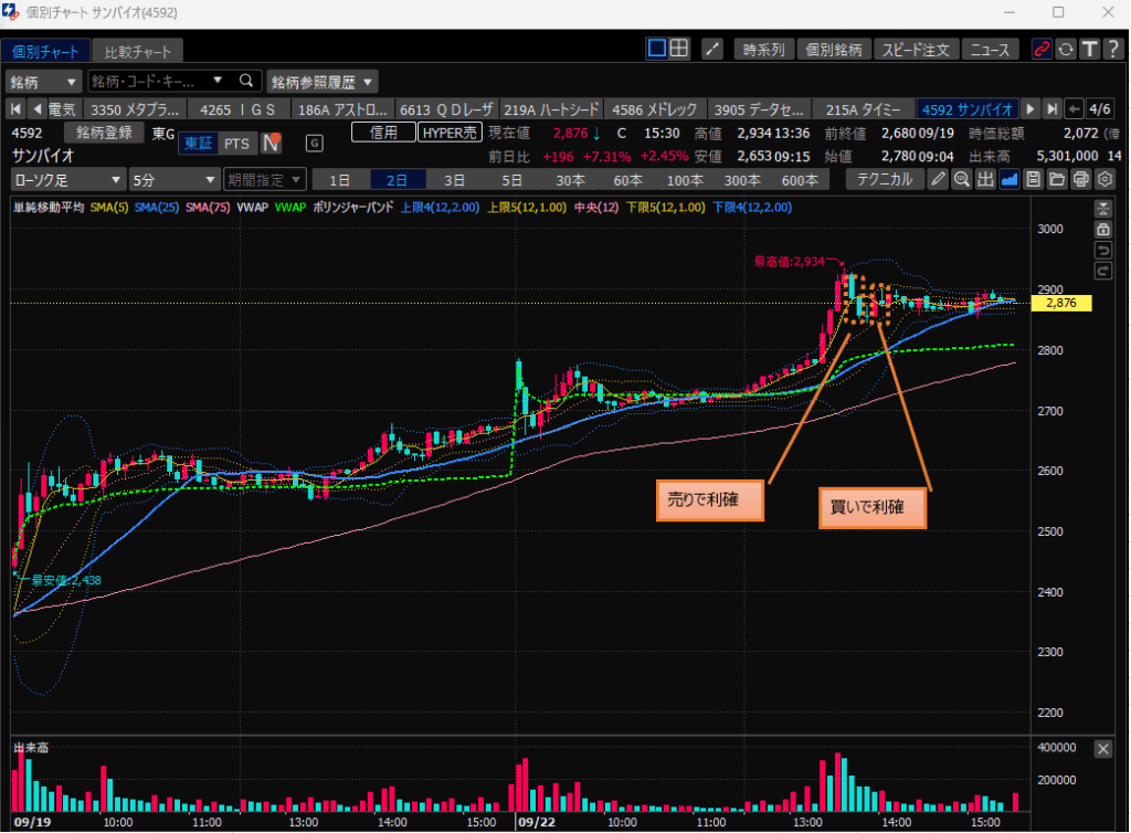 ・サンバイオ、13時半頃の急騰後の下げを狙って、売りでエントリし利確。その後の小リバウンドも買いで利確。