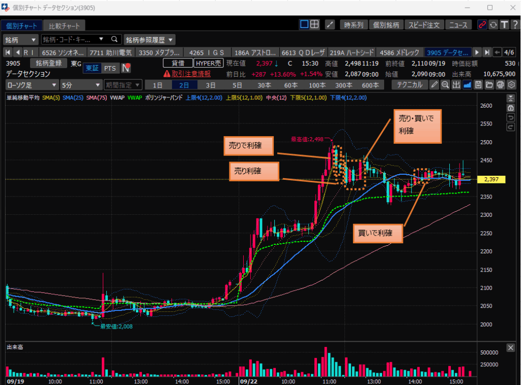 ・データセクション、前場引け間際での急騰を検知したので、売りでエントリして利確。急騰で買いでとれなかったのが悔やまれます。。。