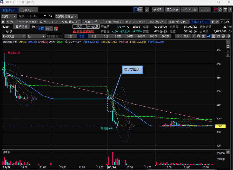 ・寄りからIGSに買いエントリ。するや否や下落。。。特売りになり、、急いで成り行き売りで損切撤退。。一撃ででマイナス6500円なり、、、。(その後ストップ安監獄に行かれたので逃げで正解。。)