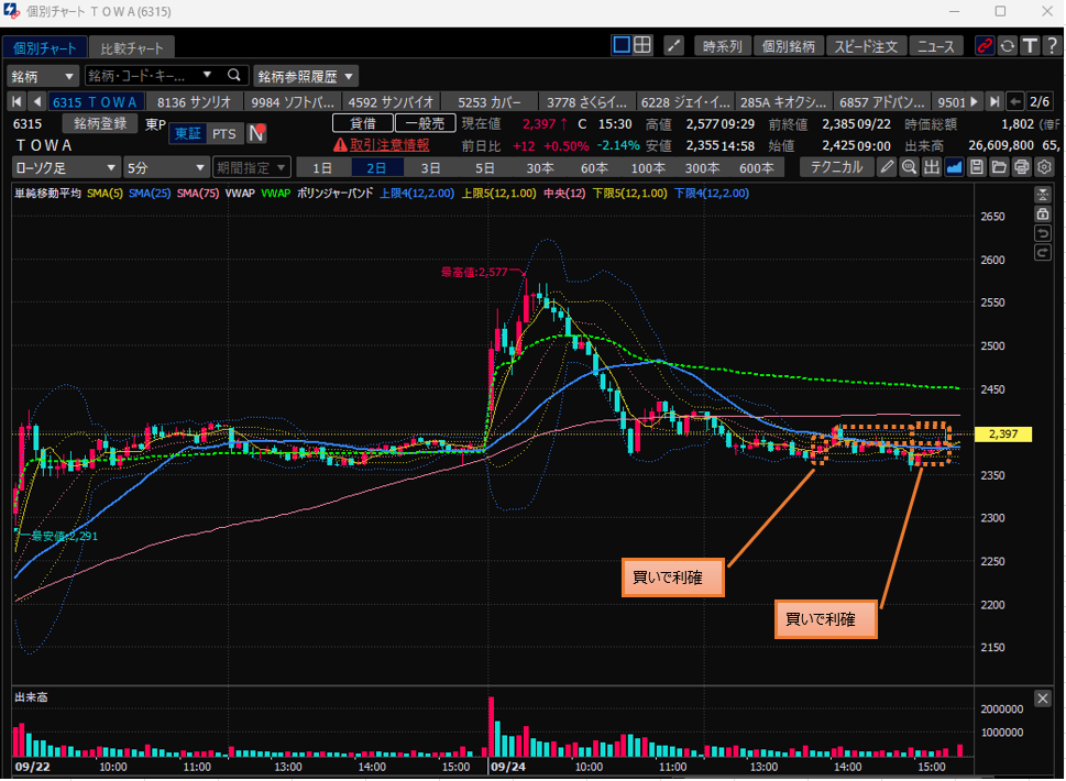 ・TOWA、14時ごろ横横からの上げを期待して買いエントリ、引けにかけて監視しつつ微益で利確。期待していたほどの上昇はなかったです。。