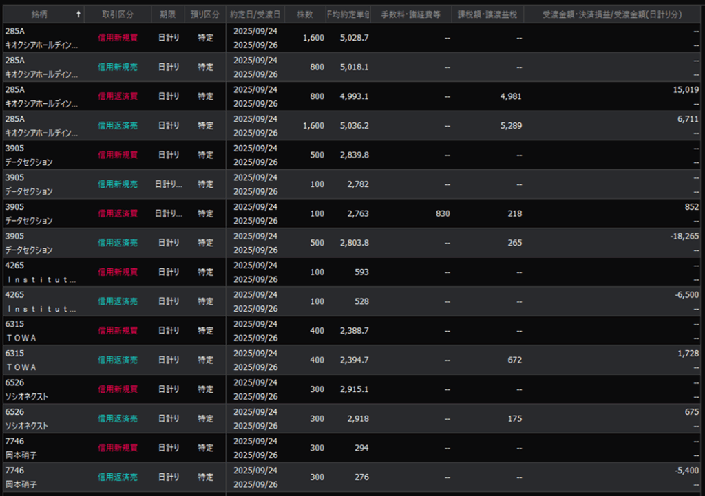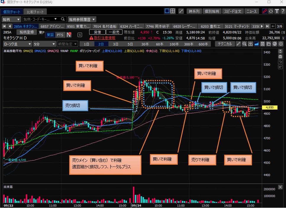 ・キオクシアをストーキング、、。買い売りにてエントリしつつ利確・損切。。横横になってしまったので細かくレンジで利確。引けまで常時監視しつつ微益を利確。