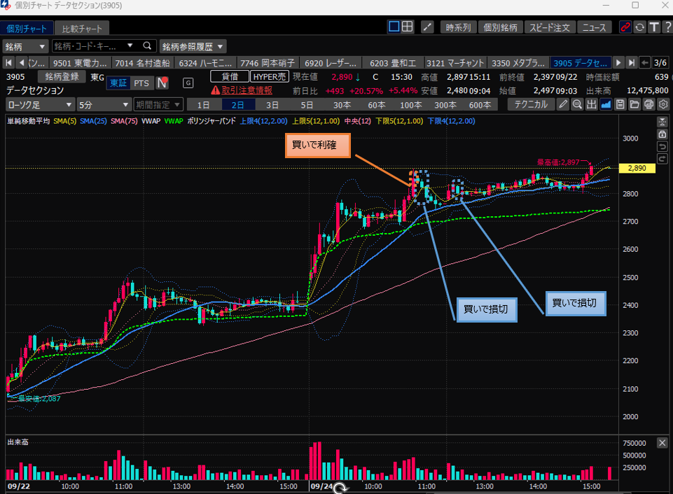 急騰に飛び乗る際は、下げを警戒しつつ入ること。。(データセクションのように)急騰から急激に売り圧(利確売り)が降ることは、ままあるので、その前に買いは手じまい。。。深追いして買いでエントリしないこと。。。なんならワンテンポおいてからの売りエントリのほうが勝率が高そう。。